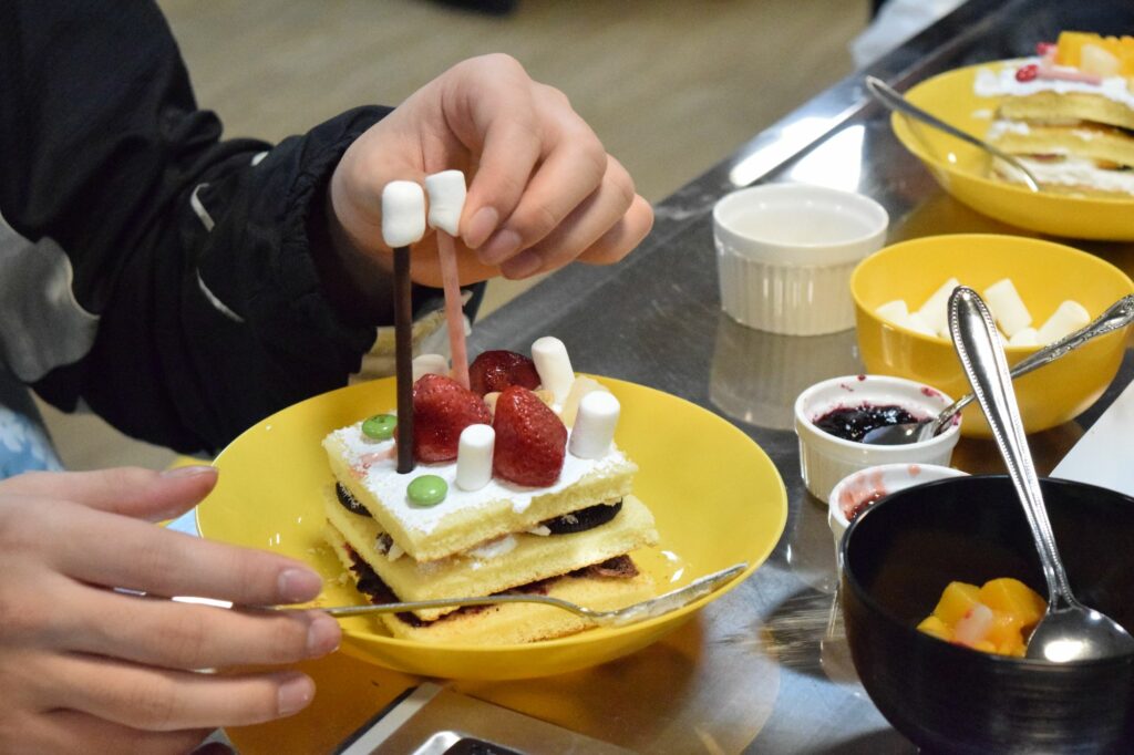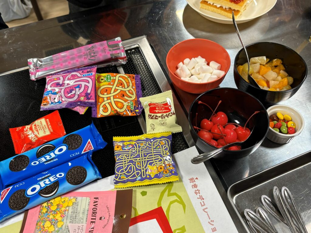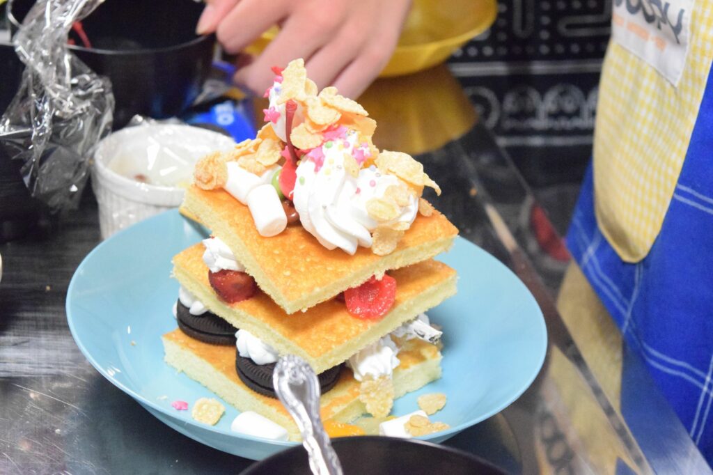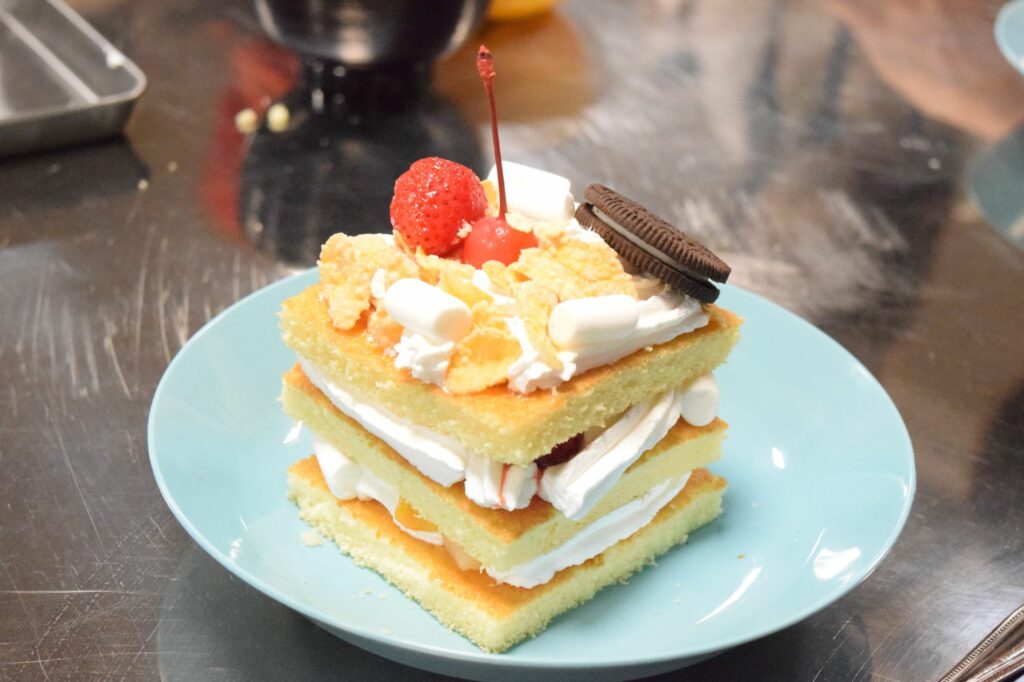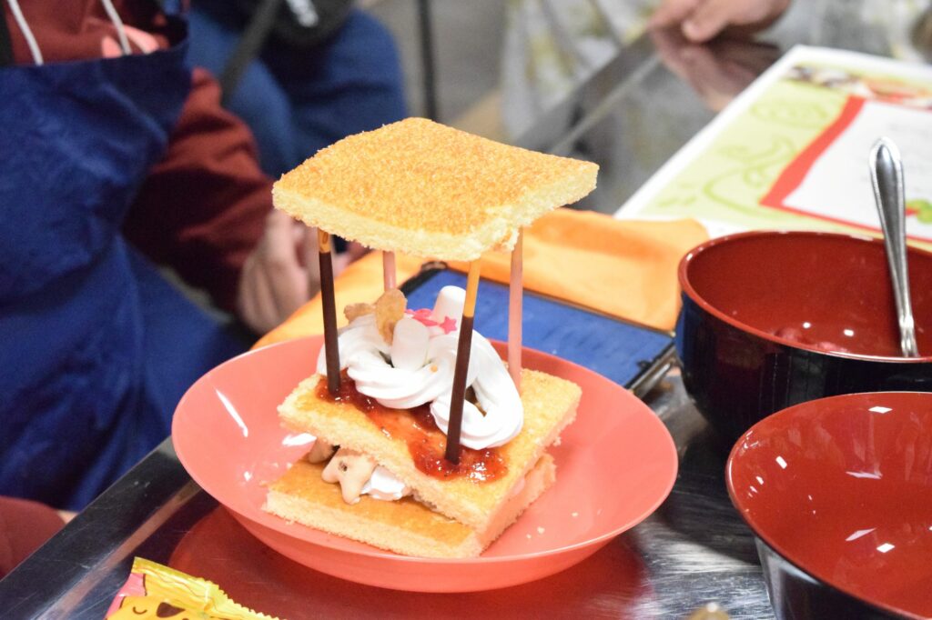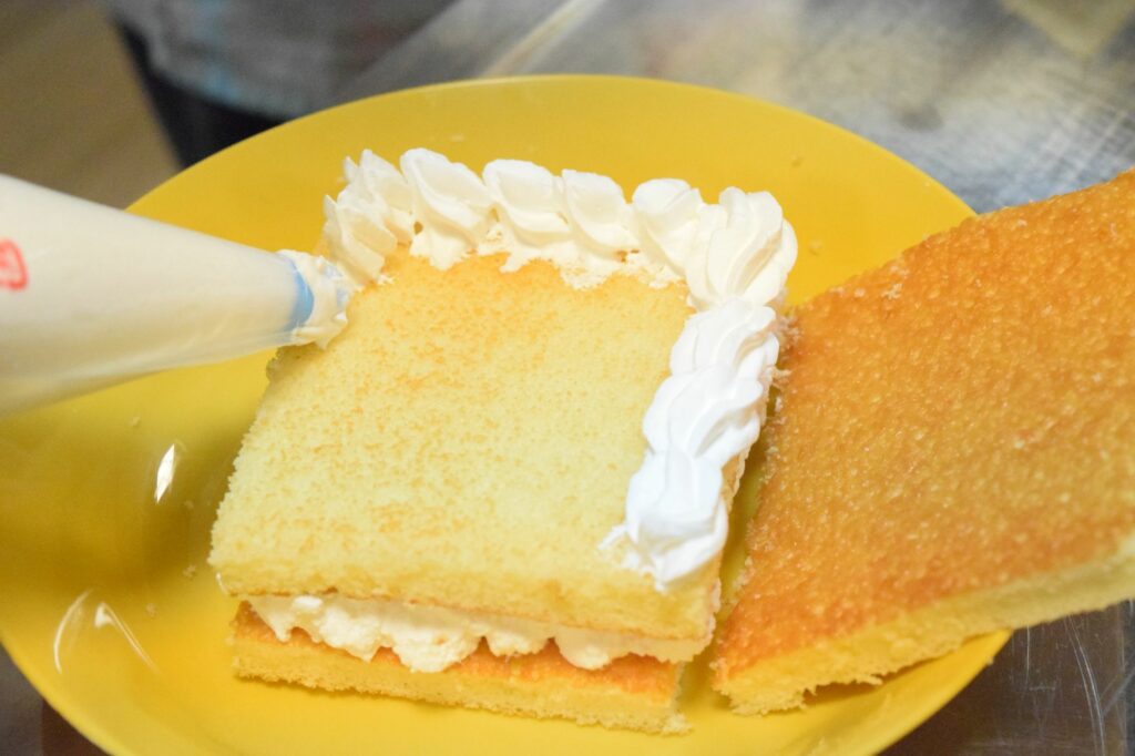 班のメンバーでスポンジを切り分けたあとは、生クリームやフルーツ、お菓子でデコレーション★